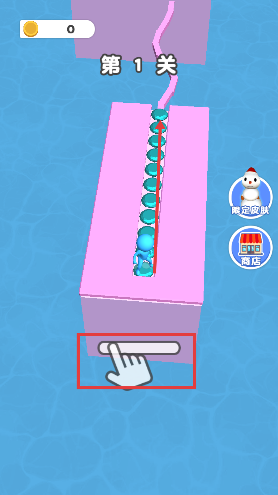 1、第1关点击底部滑动条,驱动蓝色小人推动宝石,沿粉色路径启动收集。