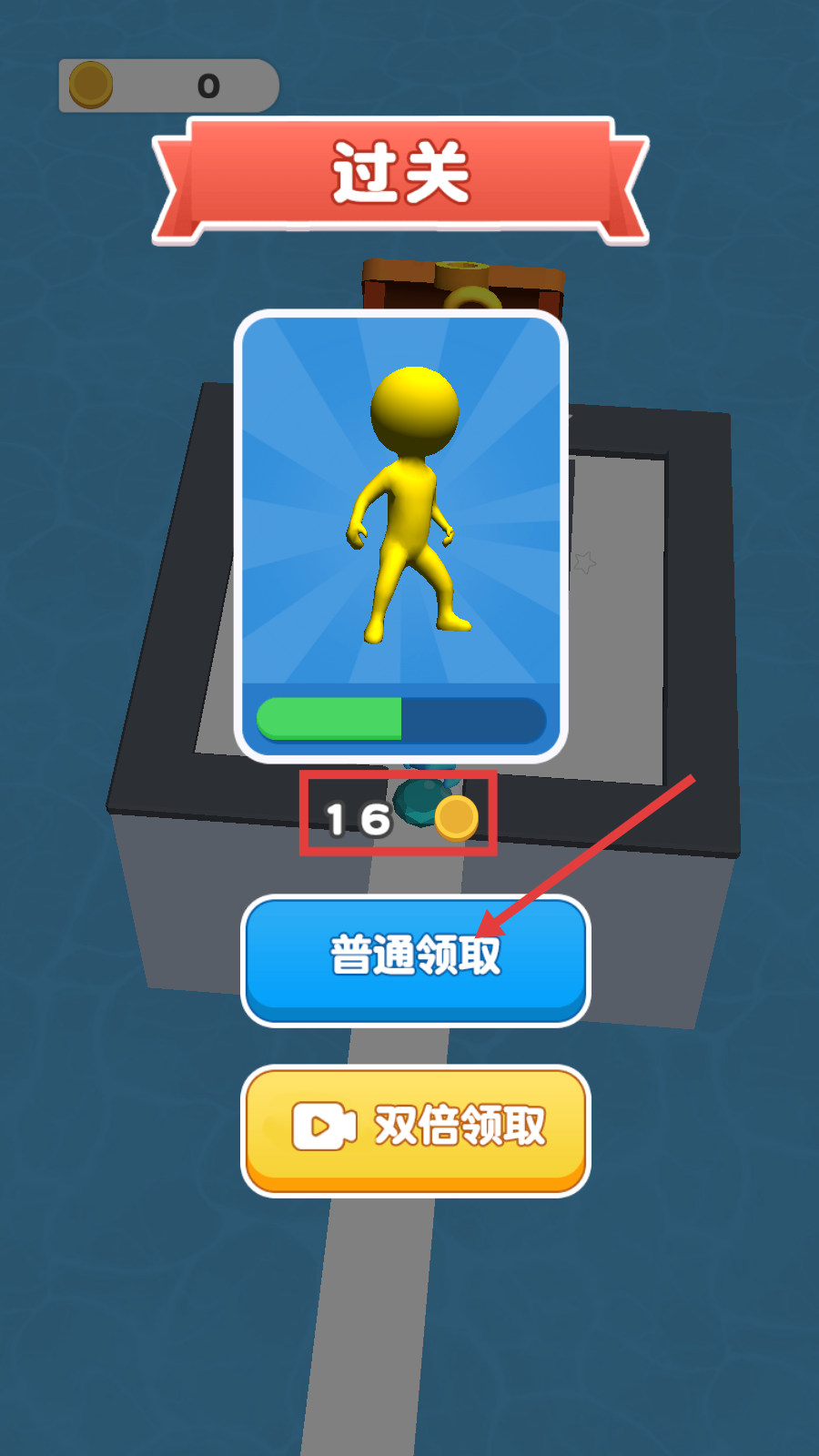 4、通关后点击【普通领取】,获取16金币,积累资源解锁角色或道具。