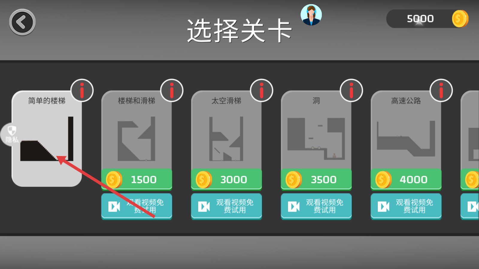 1、选关界面点击【简单的楼梯】,消耗金币(初始5000)启动关卡。