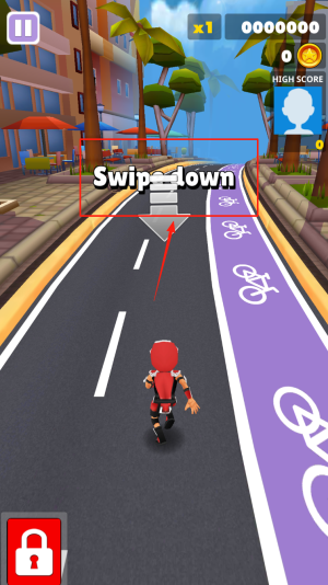 4、向下滑低穿:看到“IGHSCOR”及“Swipdown”字样时,手指向下滑使角色低姿态穿过下方障碍完成关卡。