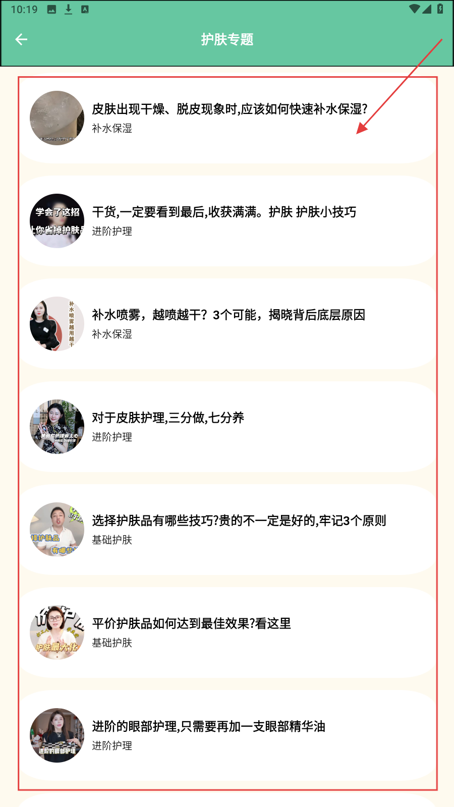 4、还可以切换至【护肤专题】页面,查看护肤教学,学习护肤知识。