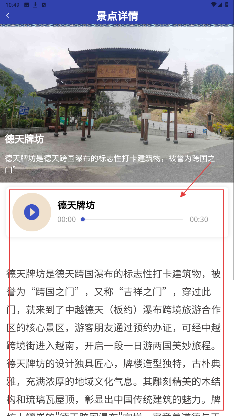 3、在【景点详情】页面,查看景点信息、音频介绍,深入了解景点背景。