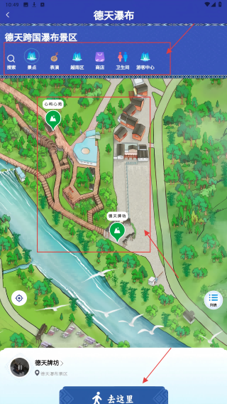 4、点击【智慧导览】,进入【德天瀑布】页面,在地图中点击想去的景区,再点击【去这里】即可规划路线。