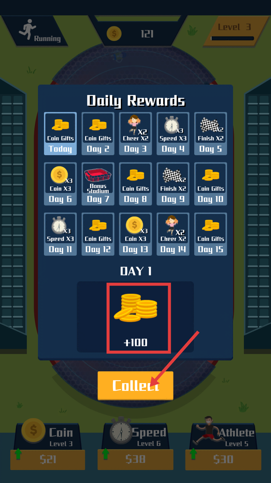 1、每日奖励界面点击【Collect】,领取【Day-1-+100】金币,积累初始资源。