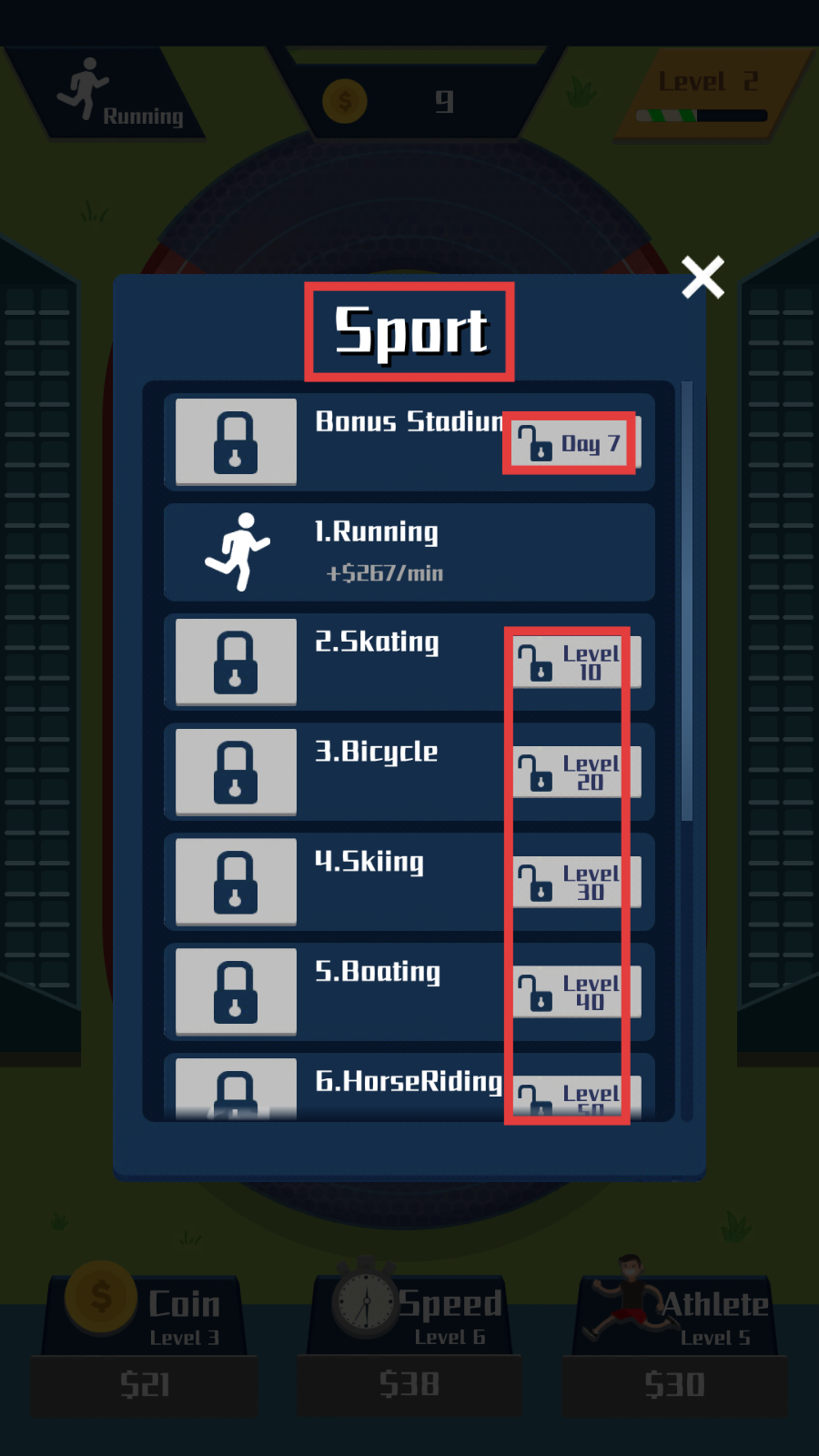 2、进入【Sport】界面,留意项目解锁条件(如【Day-7】【Level-10】),规划解锁节奏。
