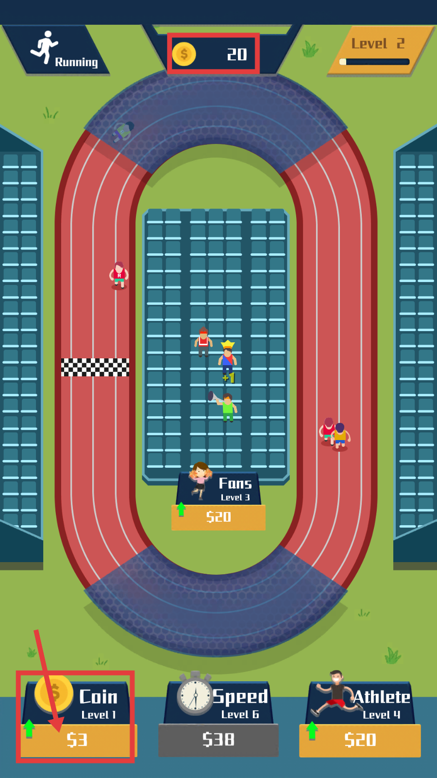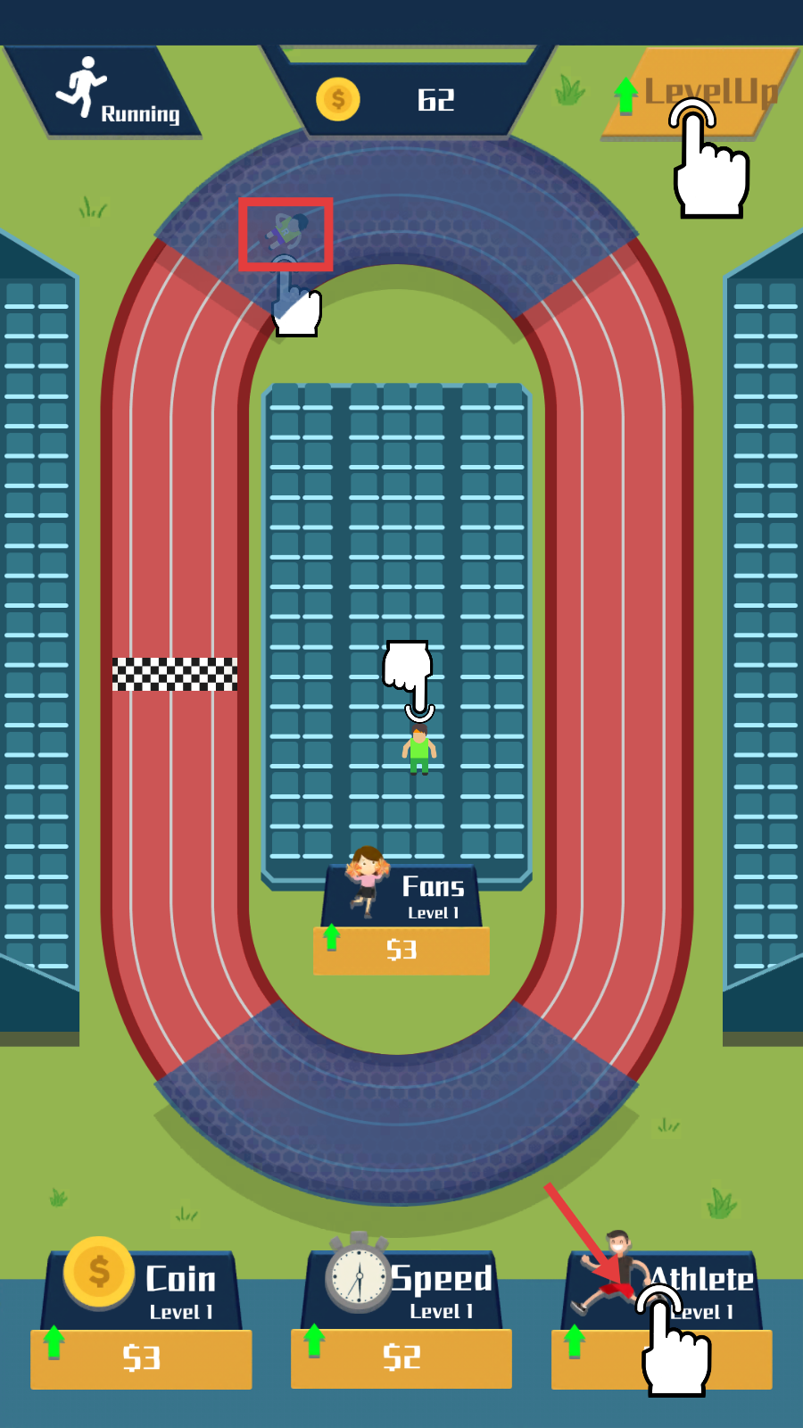 3、跑道界面拖动运动员部署,点击【Athlete】和【LevelUp】升级,增强竞速实力。