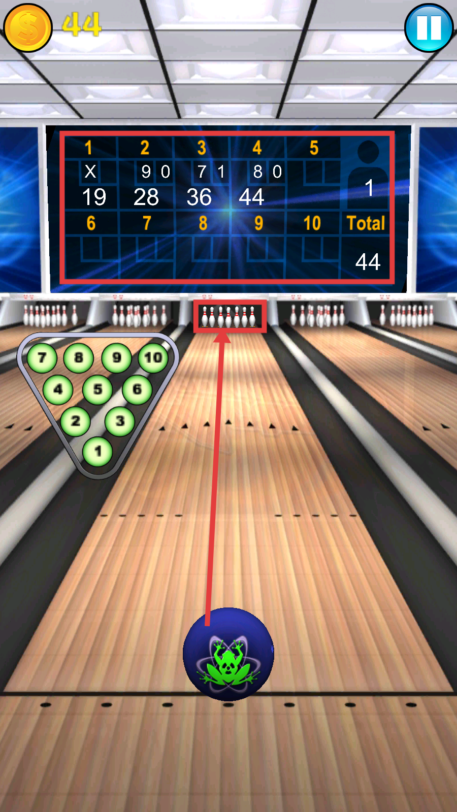 3、实战中瞄准前方球瓶,参考顶部【得分板】(如44分进度),优化投掷角度,提升全中率。