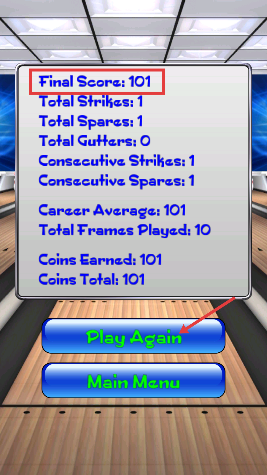 4、结算界面查看【FinalScore:101】,点击【PlayAgain】重启挑战,冲击更高分数。