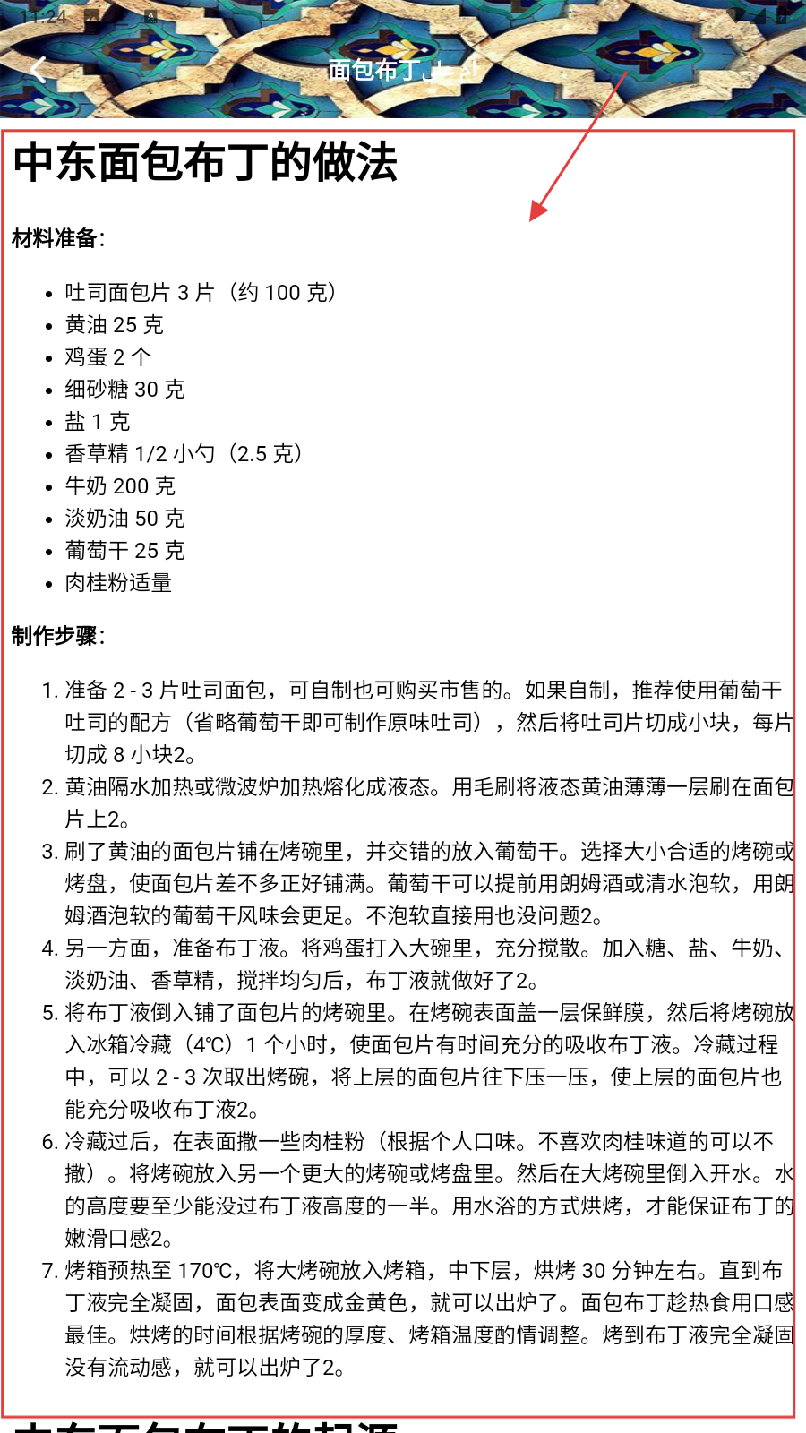2、点选面包布丁,查看【中东面包布丁的做法】,依材料准备与步骤尝试制作。