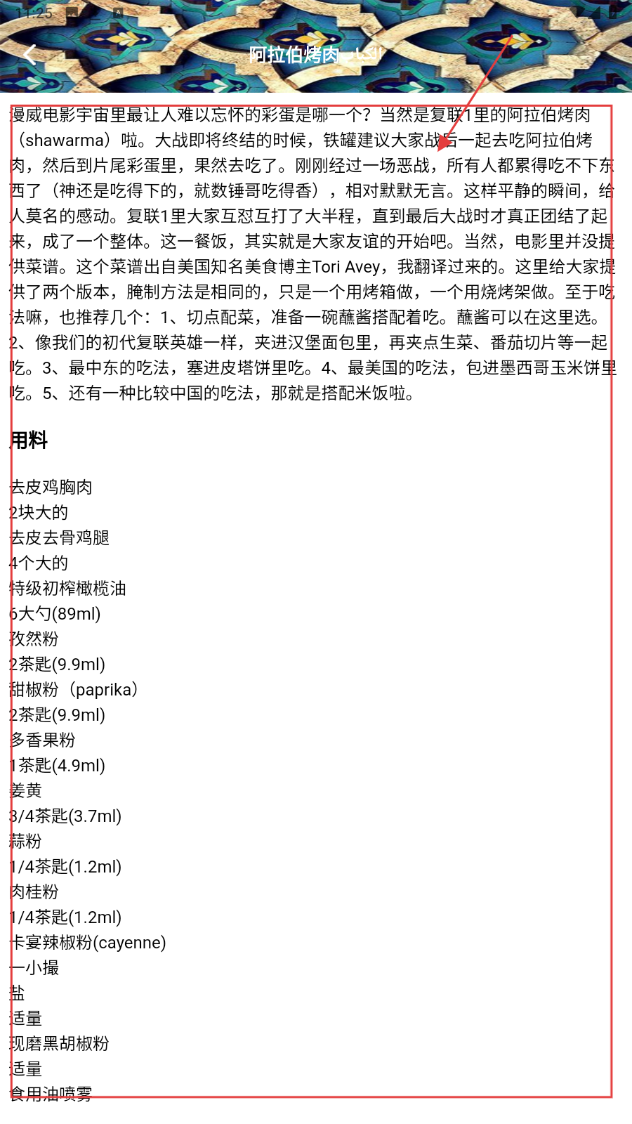 4、进入阿拉伯烤肉详情,了解漫威彩蛋关联与菜谱,按用料和做法制作特色烤肉。