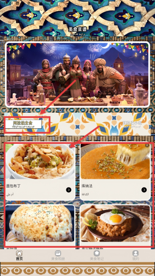 1、进入【首页】,选【阿拉伯主食】,浏览面包布丁等菜品,开启美食探索。