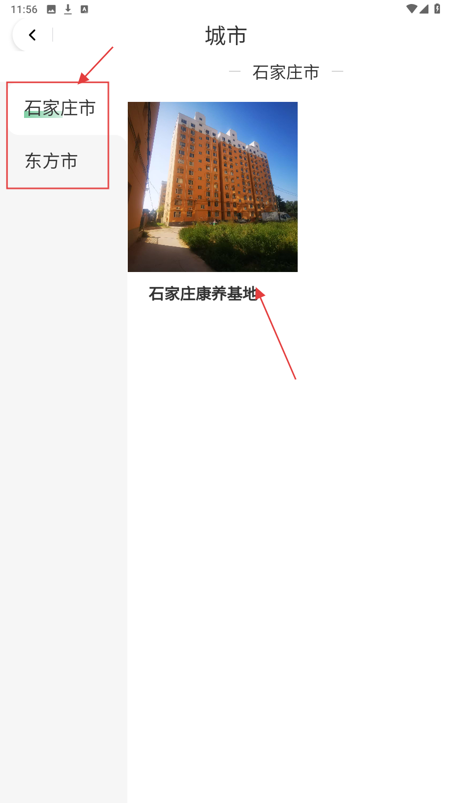 1、在首页点【康养基地】,选城市(如石家庄市),查看对应康养基地。