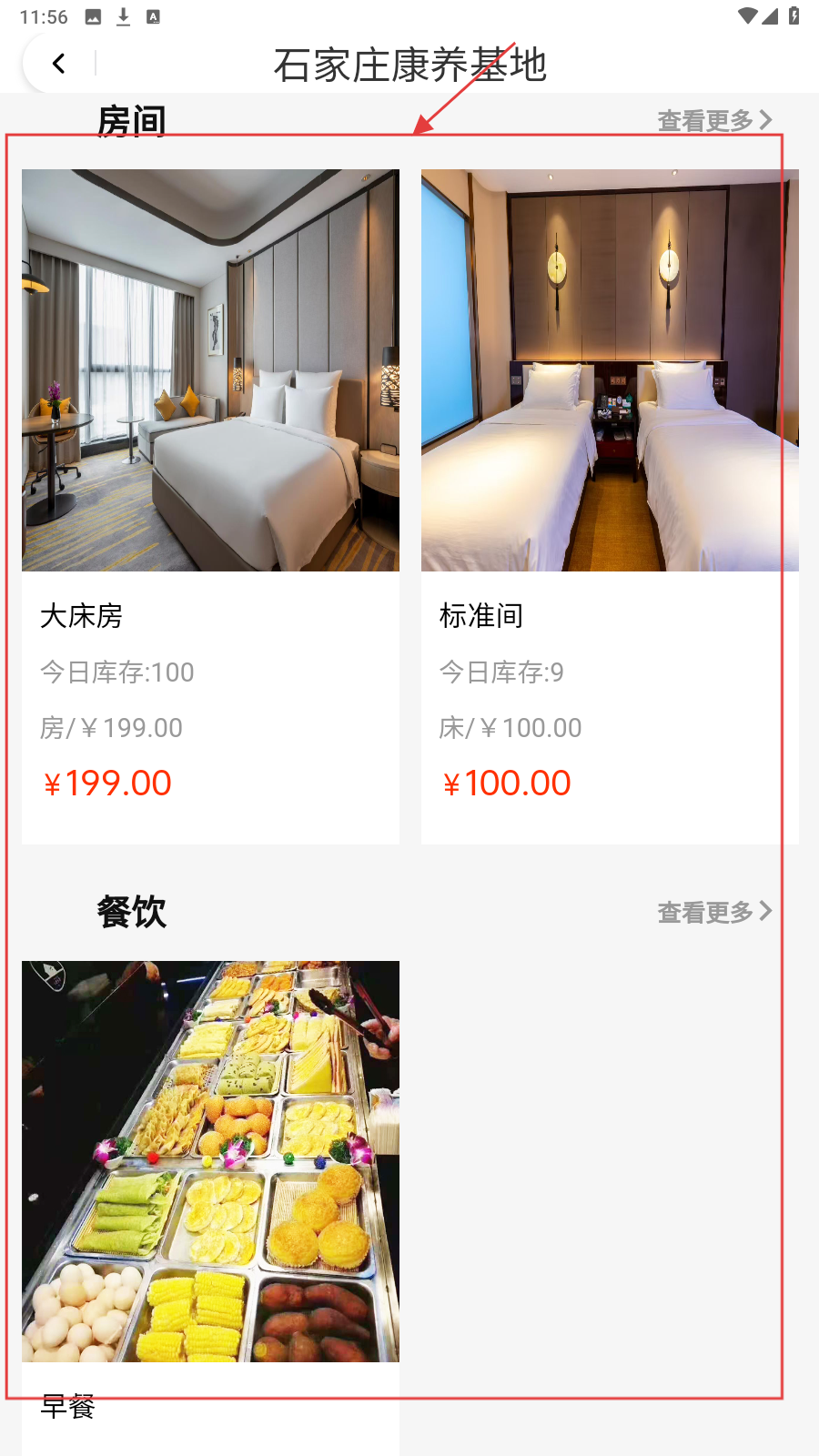 2、进入石家庄康养基地,浏览房间(如大床房)、餐饮等信息,了解服务。