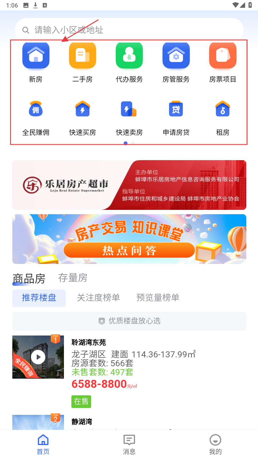 1、打开APP,选【新房/二手房】等业务入口,或用搜索找目标小区。