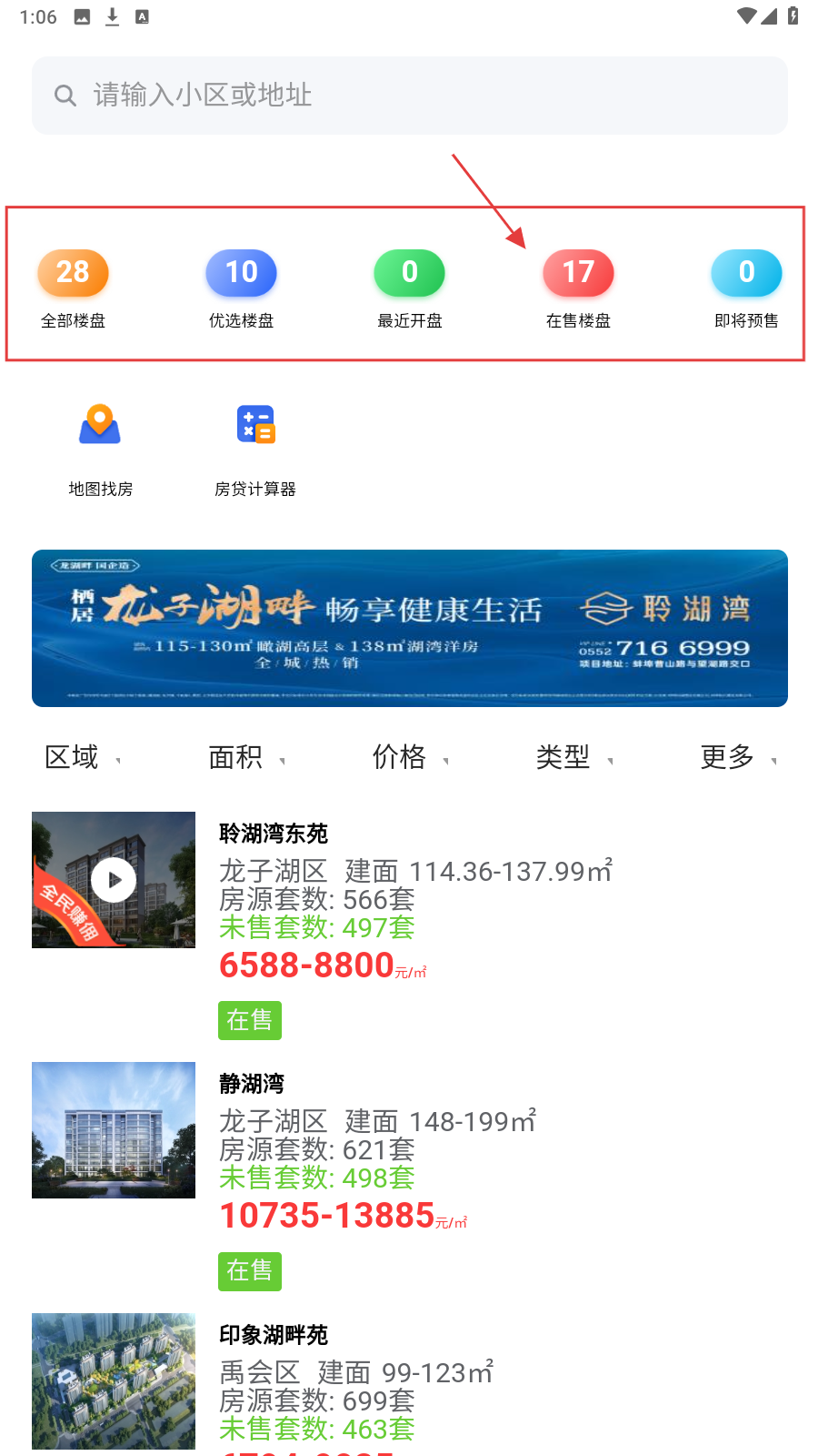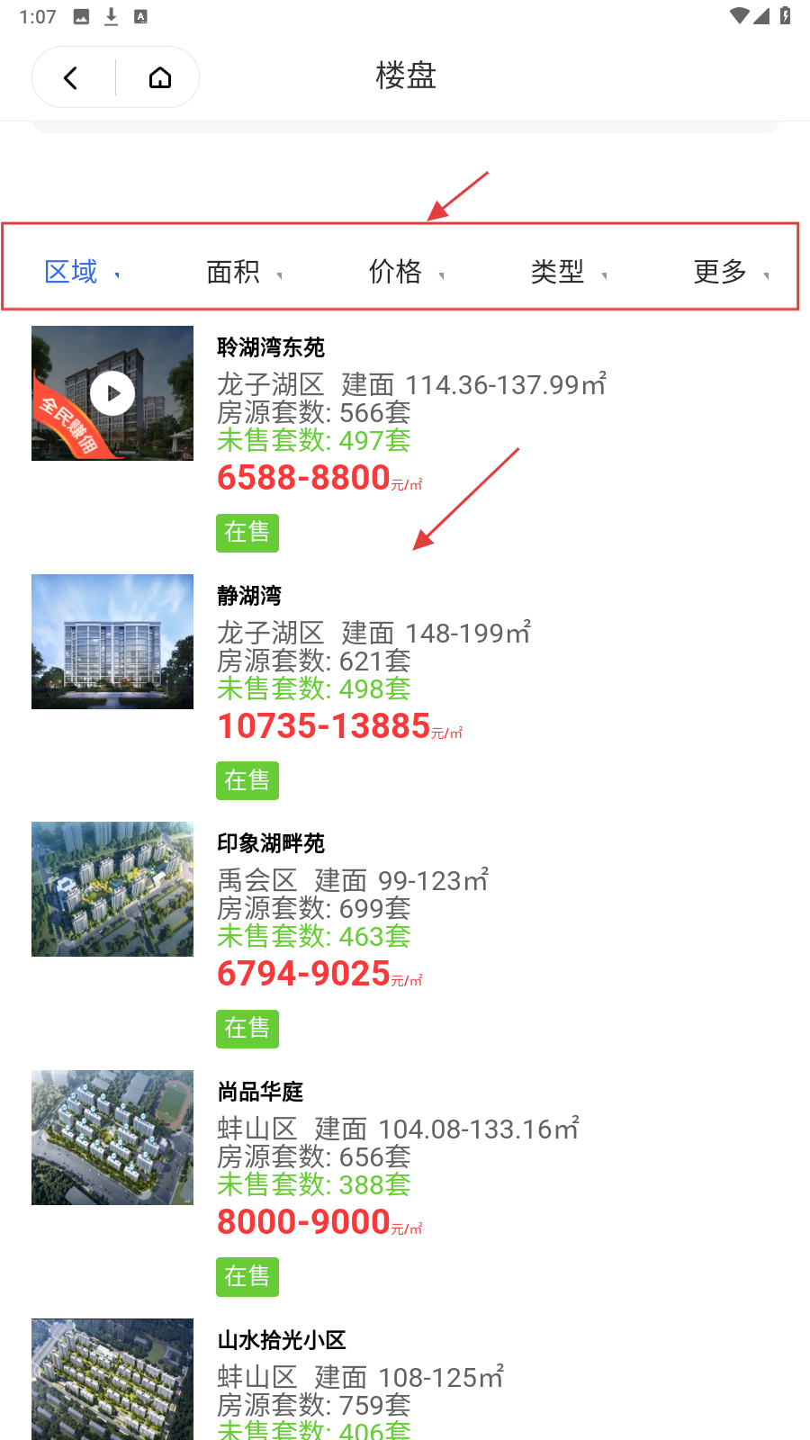 3、在楼盘页,按【区域/面积/价格】筛选,定位心仪房源(如静湖湾)。