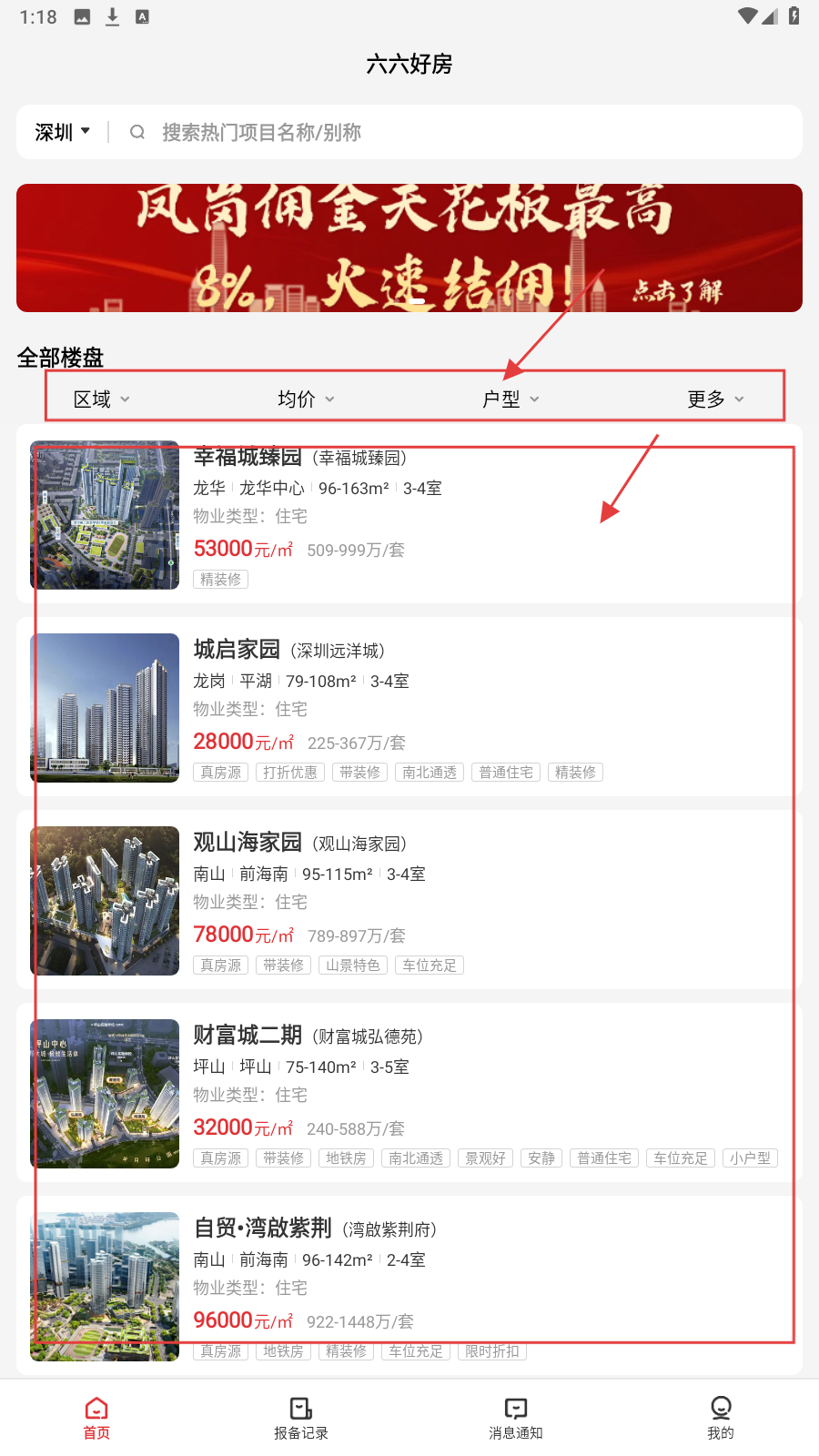 1、在首页用【区域/均价/户型】筛楼盘,选幸福城臻园等心仪房源。