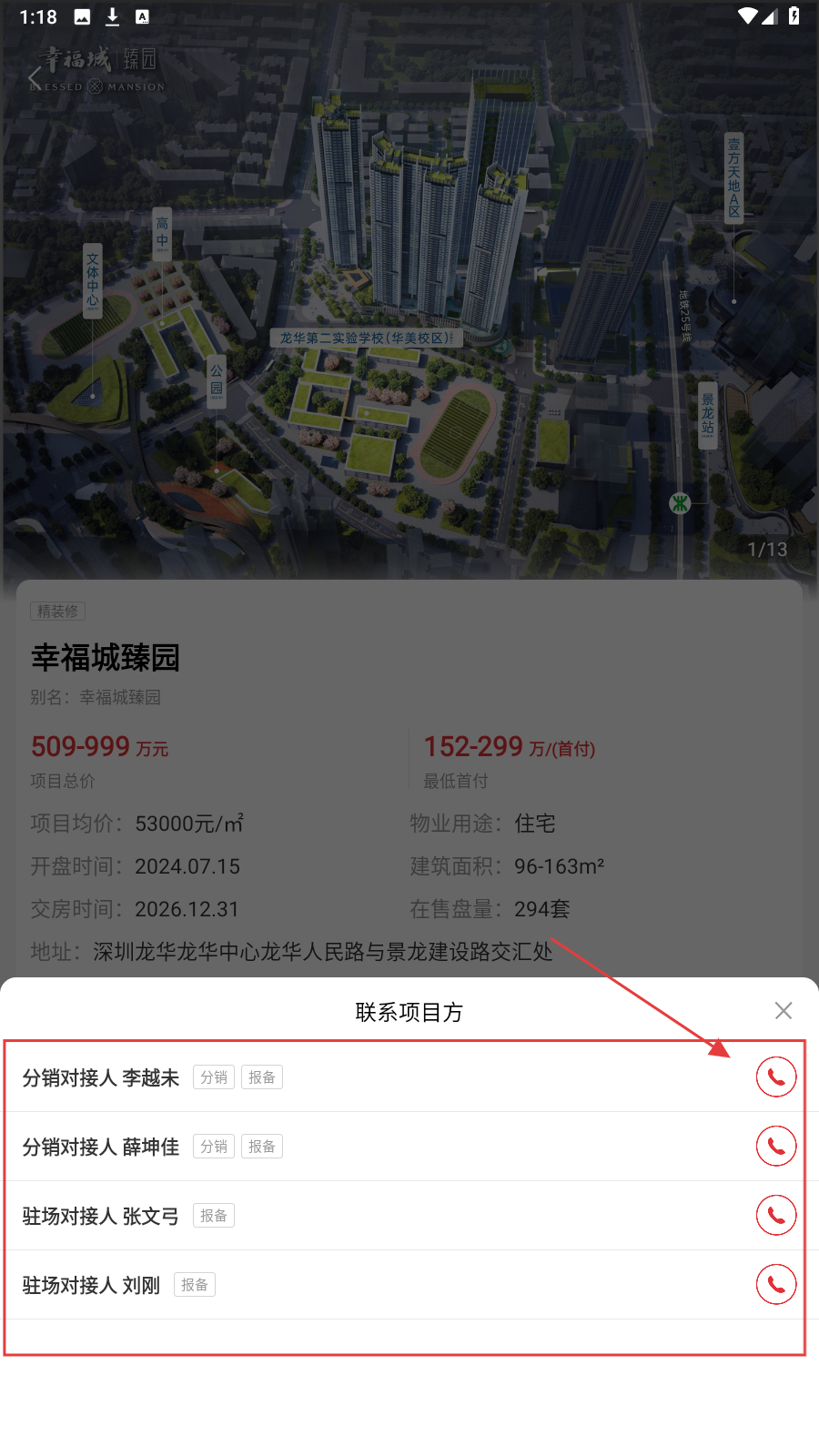 2、点进楼盘详情,查价格、户型等,点【报备】或【联系驻场】对接。