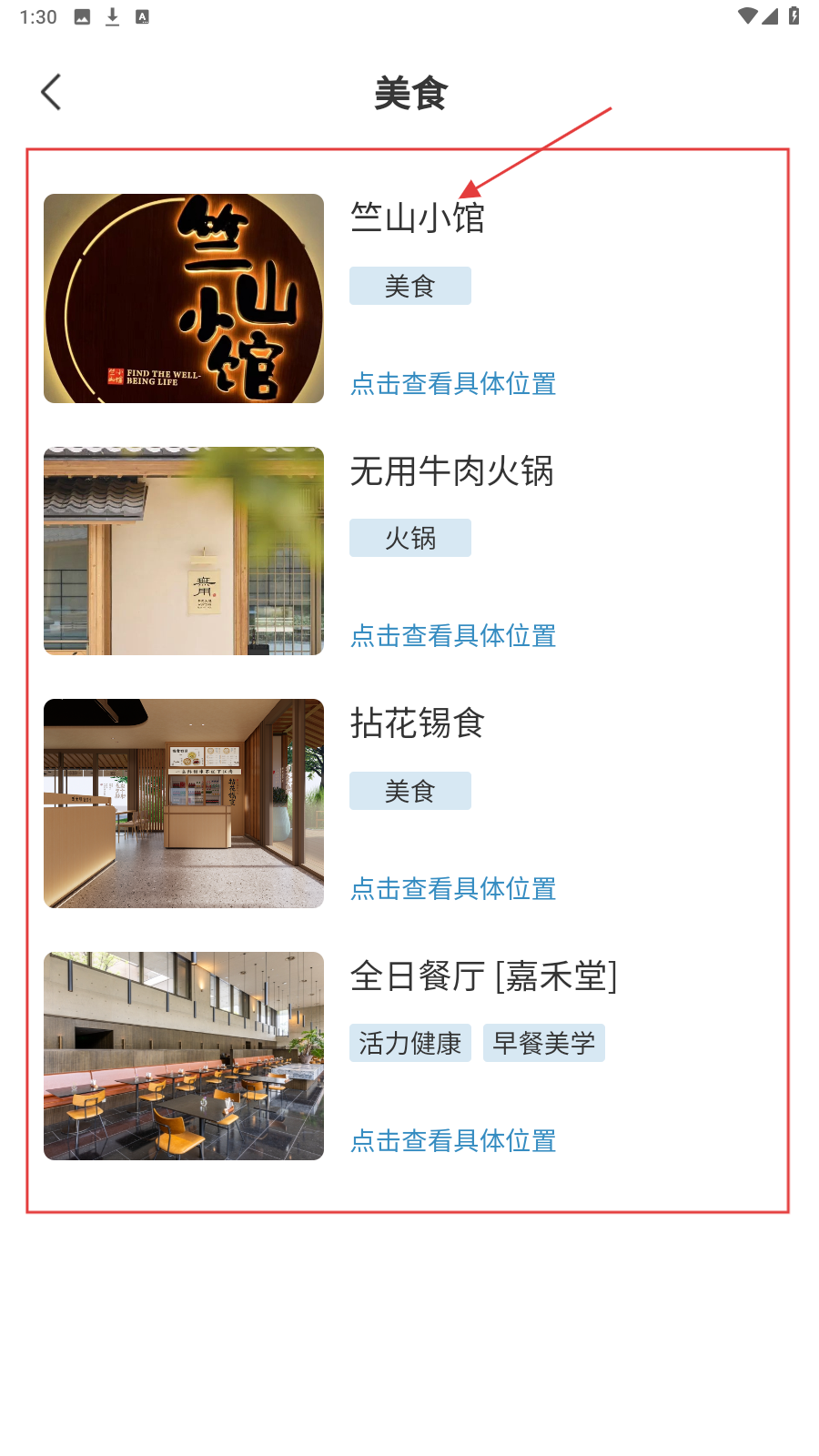 2、在美食列表,点选竺山小馆等商家,查看详情(开放时间、位置)。