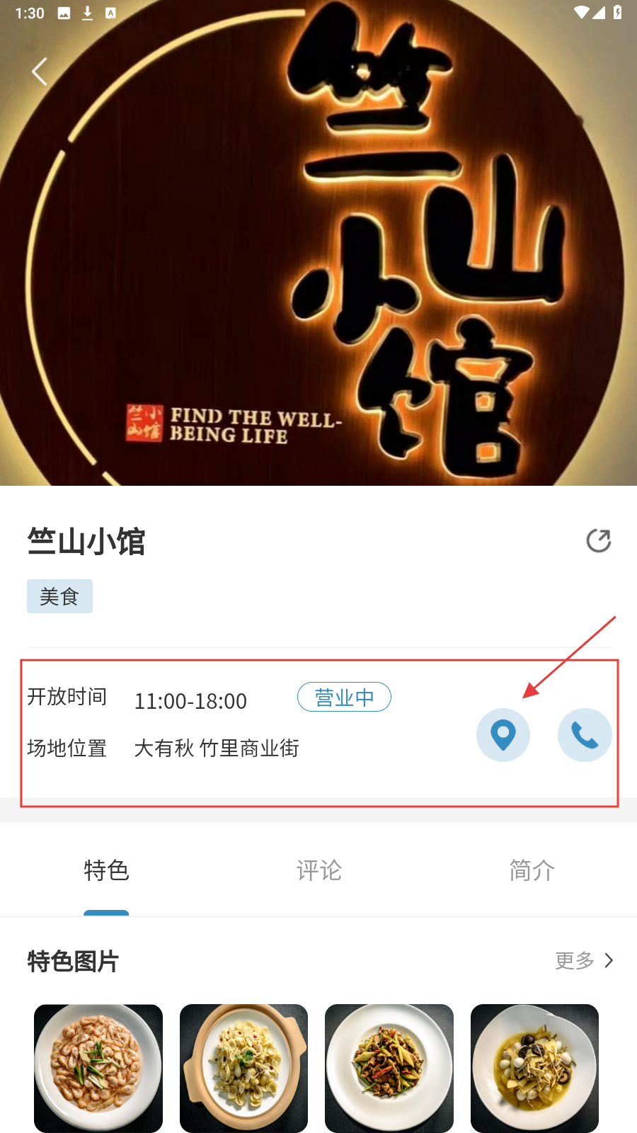 3、看竺山小馆详情,点地图标查具体位置,或拨打电话咨询营业信息。