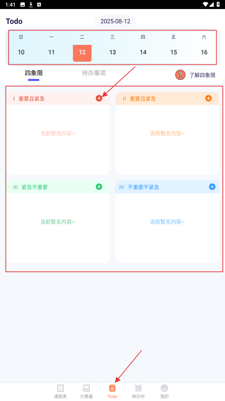 4、切换到【Todo】页,选日期,点四象限“+”添加待办事项。