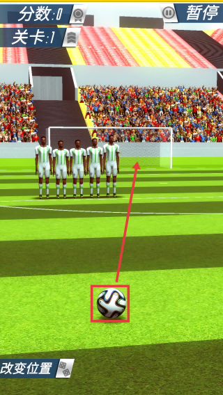 2、关卡1面对人墙,拖动足球蓄力,瞄准空隙射门,尝试攻破对方防守得分。
