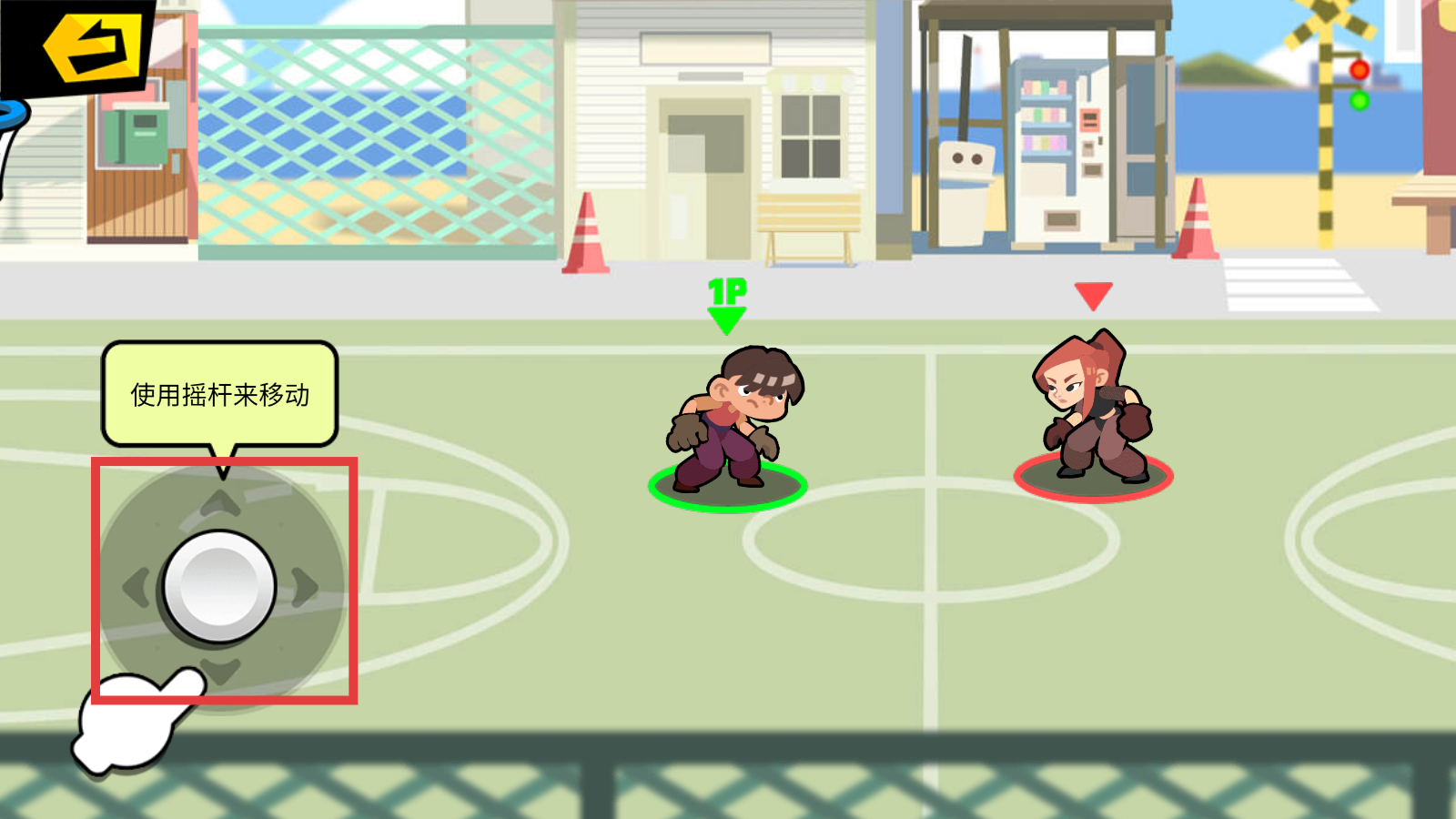 2、通过左侧【摇杆】操控【1P】角色移动,熟悉走位操作。