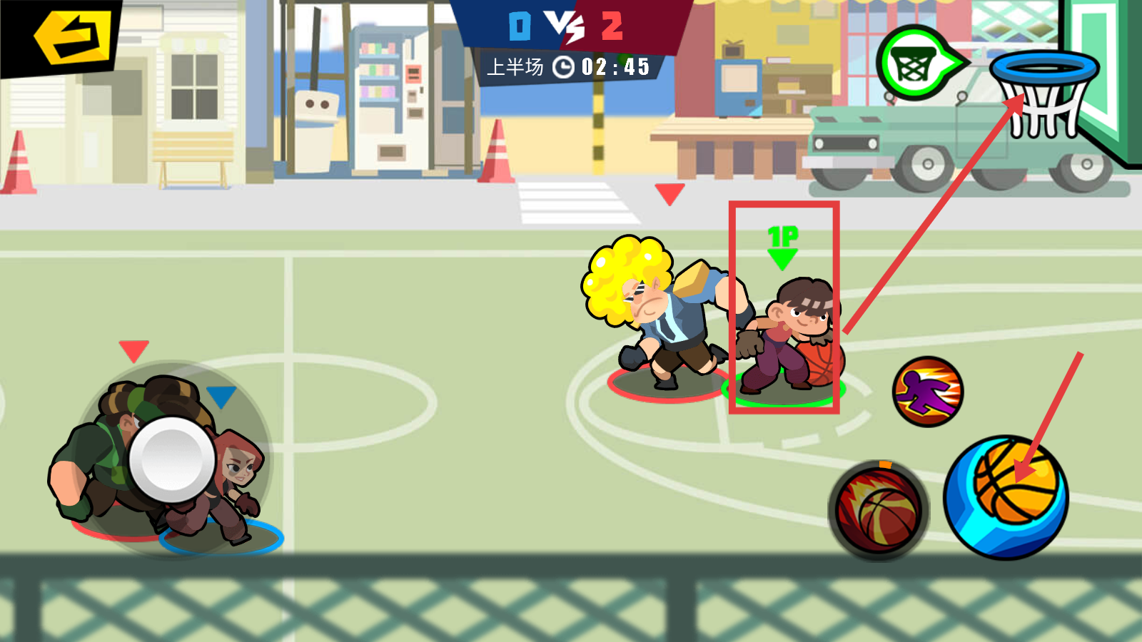 3、比赛中争夺篮球,搭配右侧技能球,突破防守尝试投篮得分。