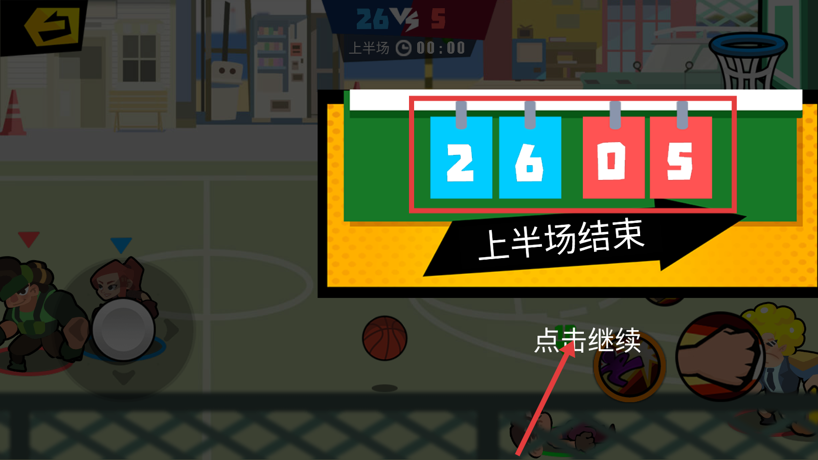 4、上半场结束后,查看【26-5】比分,点击【继续】开启后续赛程。