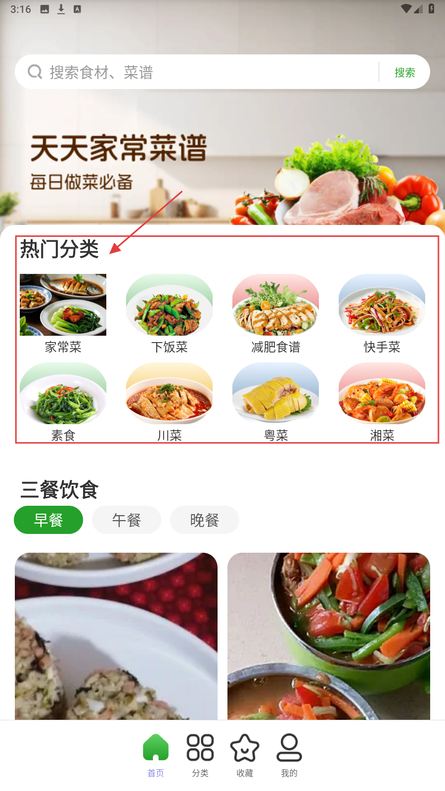 1、打开APP,选【热门分类】里的菜系,比如【家常菜-下饭菜】找想做的菜。