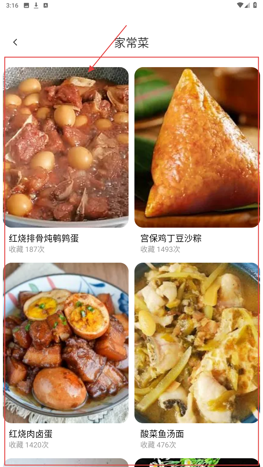 2、进入【家常菜】分类,浏览菜品列表,挑【红烧排骨炖鹌鹑蛋】这类感兴趣的菜。