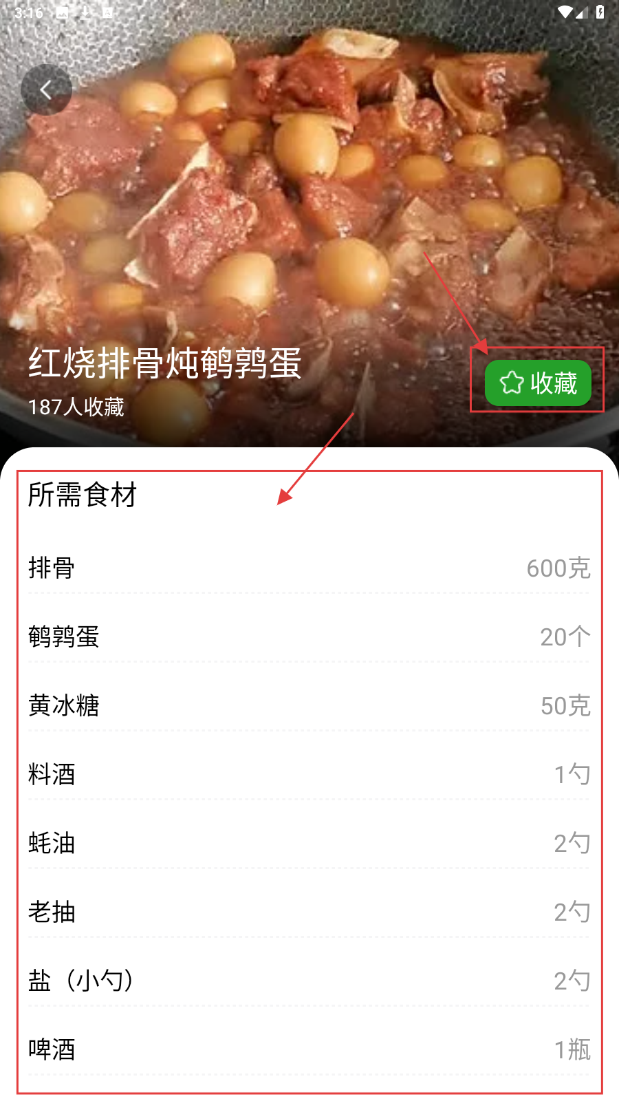 3、点开菜品详情,看【所需食材】准备材料,点【收藏】方便下次找菜谱。