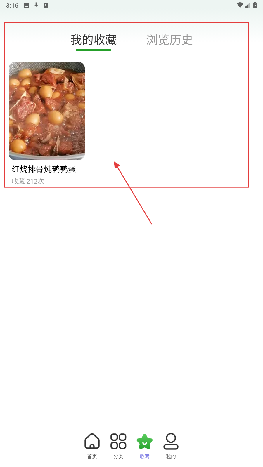 4、去【我的收藏】页,能快速找到收藏的【红烧排骨炖鹌鹑蛋】菜谱,随时查看做法。