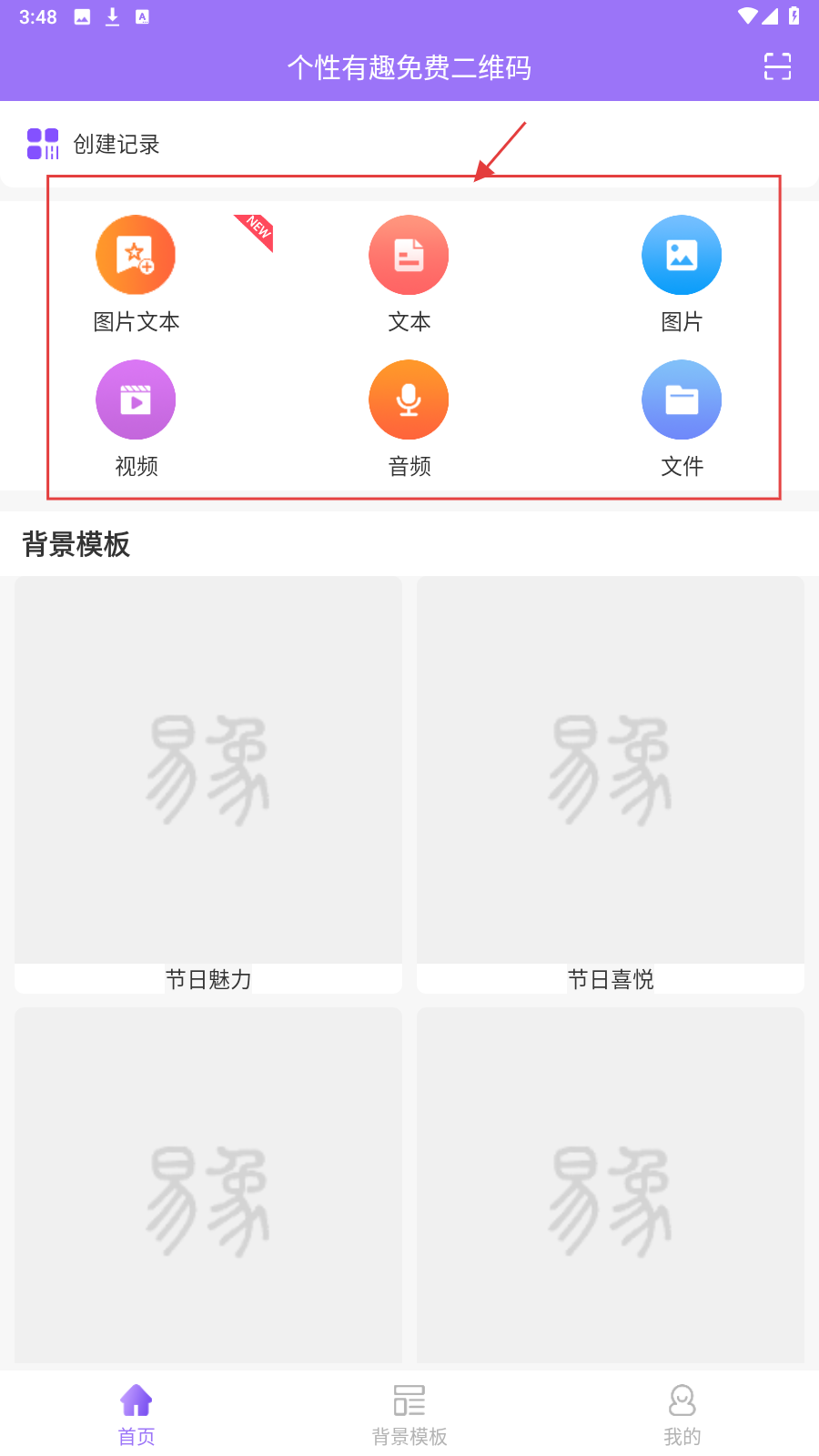 1、打开【个性有趣免费二维码】APP,选【图片文本-文本-图片-视频-音频-文件】任一类型开始创作。