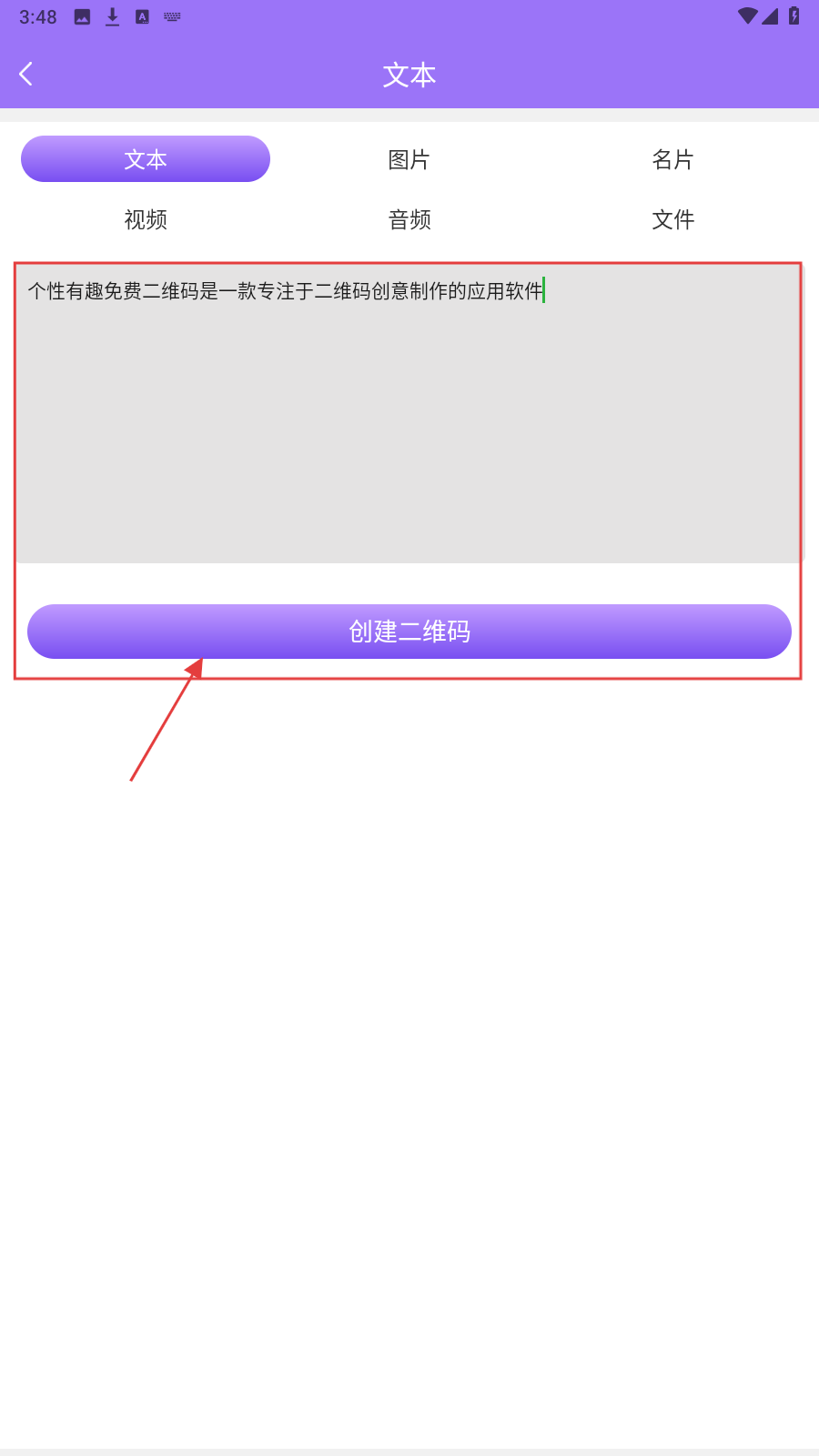 2、选【文本】类型,输入内容后点【创建二维码】,生成基础二维码。