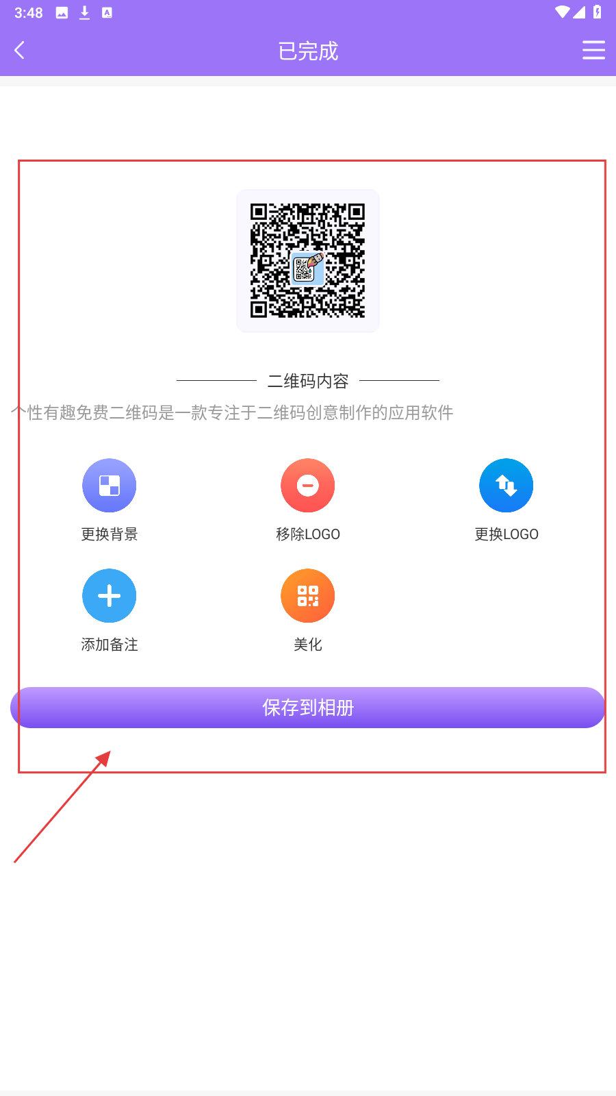 3、在【已完成】页,用【更换背景-移除LOGO】等功能美化二维码,点【保存到相册】留存。
