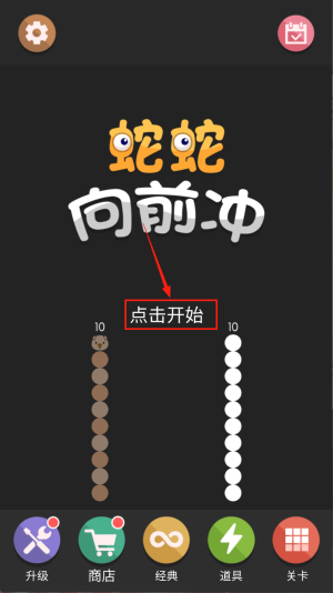 2、开始游戏:在出现“蛇蛇 向前冲”标题的主界面,点击“点击开始”按钮进入玩法提示页。
