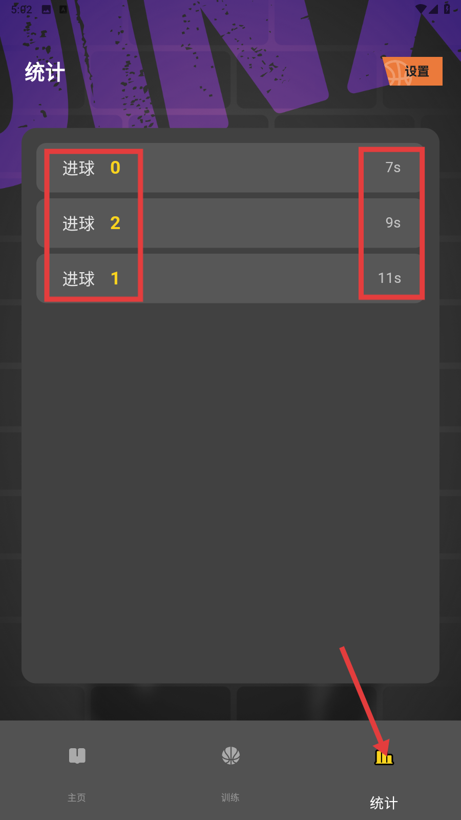1、点击底部【统计】,查看历史进球数据(如0、2、1次)及耗时(7s、9s、11s),复盘表现。