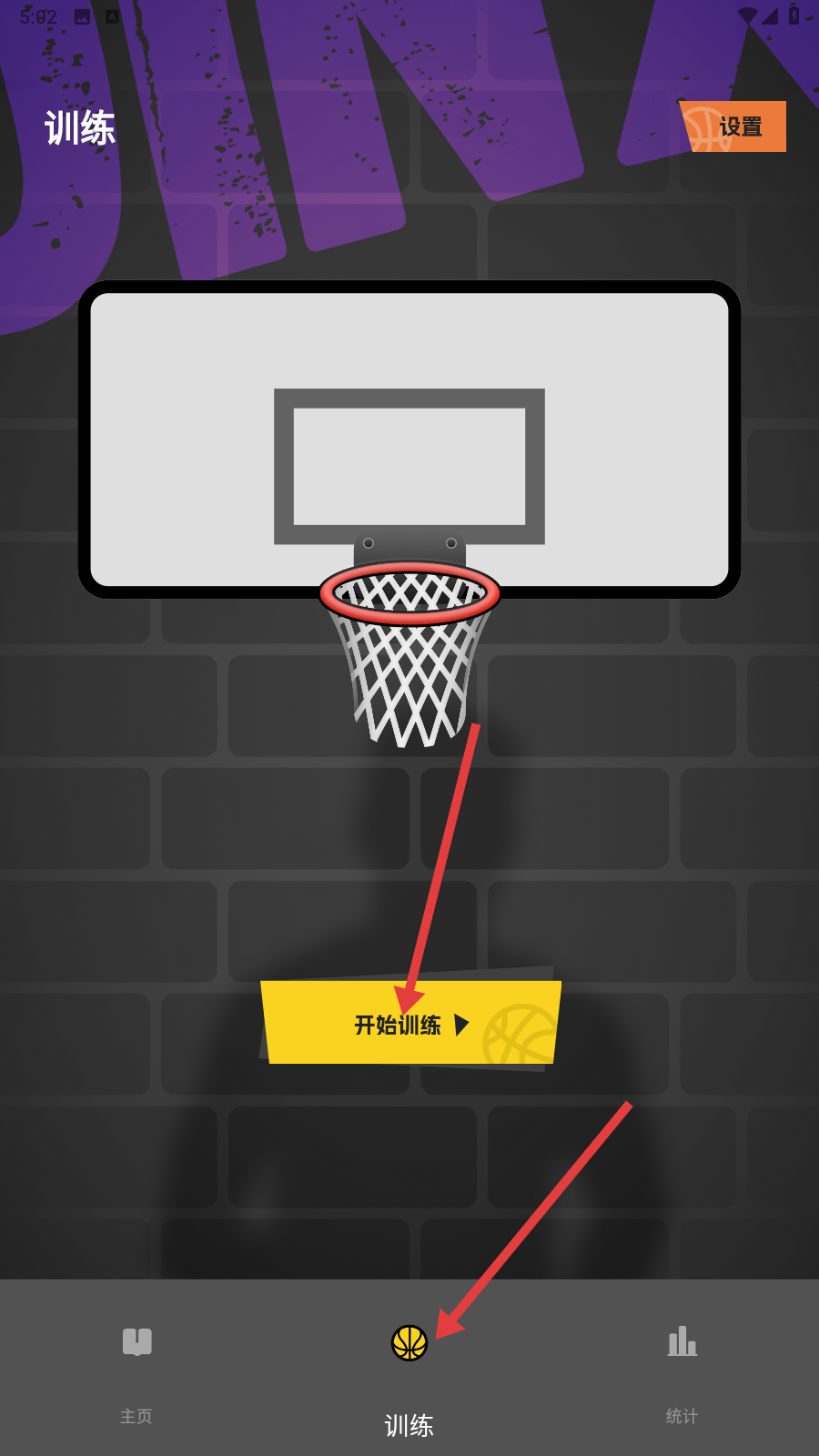 2、切换至【训练】页,点击【开始训练】,进入投篮练习模式,瞄准篮筐练习投射。