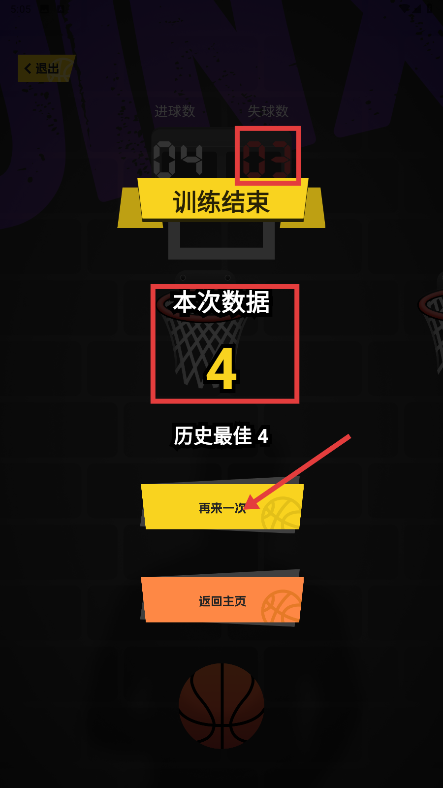 4、训练结束后,查看【本次数据(如4)】与历史最佳,点击【再来一次】重复训练,提升命中率。