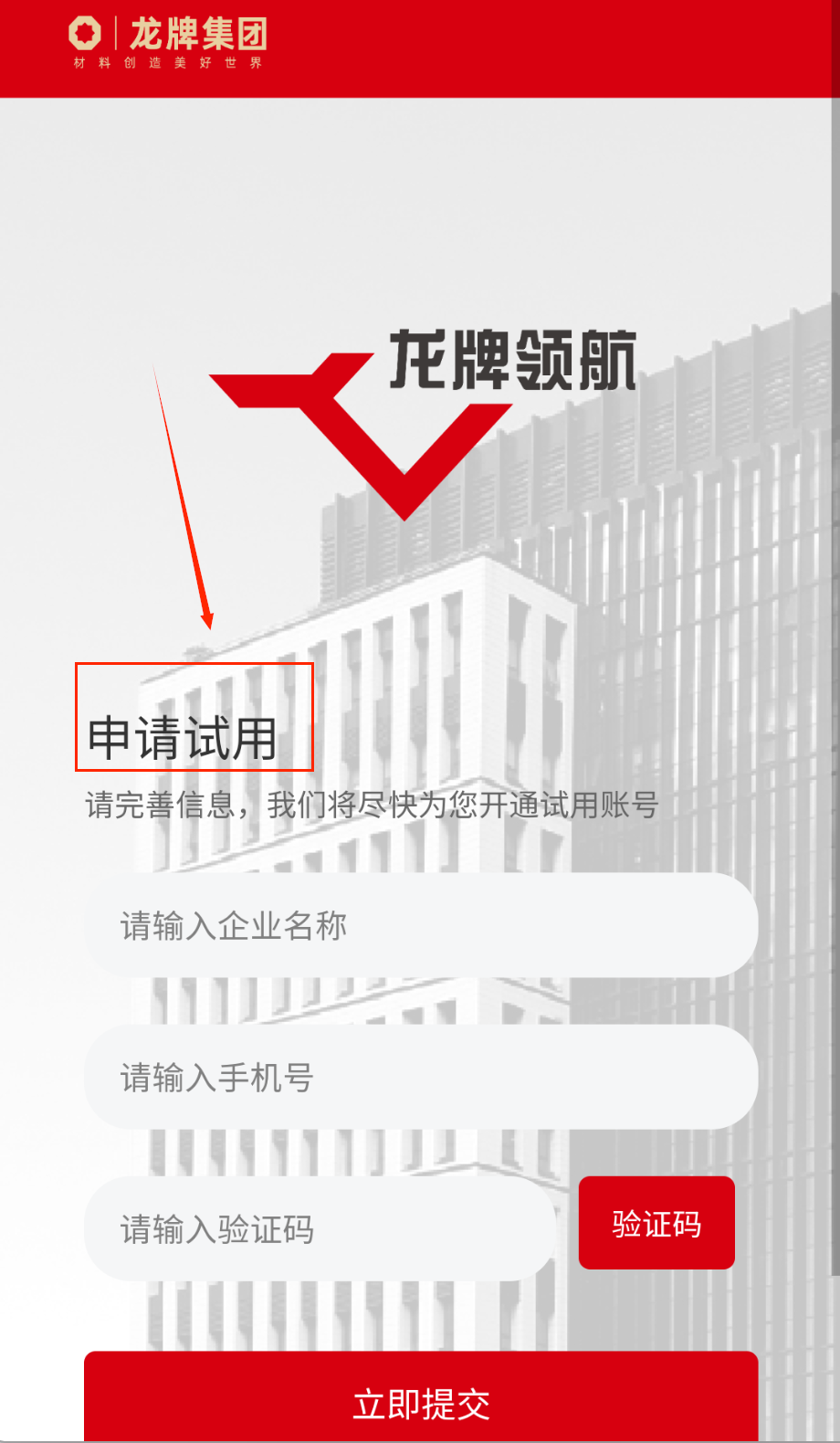 3、想要申请试用功能的话,需要如实填写企业名称和联系方式,系统会发送验证码到注册手机,正确输入验证码后点击提交按钮。