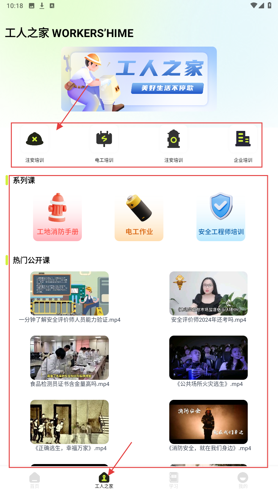 1、打开应用,在【工人之家】页面,有注安培训等功能按钮,还可以查看系列课、热门公开课。如点击【注安培训】。