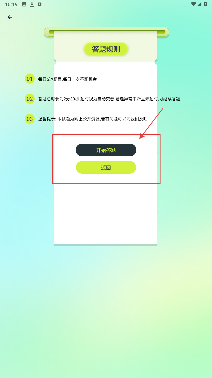 2、进入答题页面,查看答题规则,点击【开始答题】。
