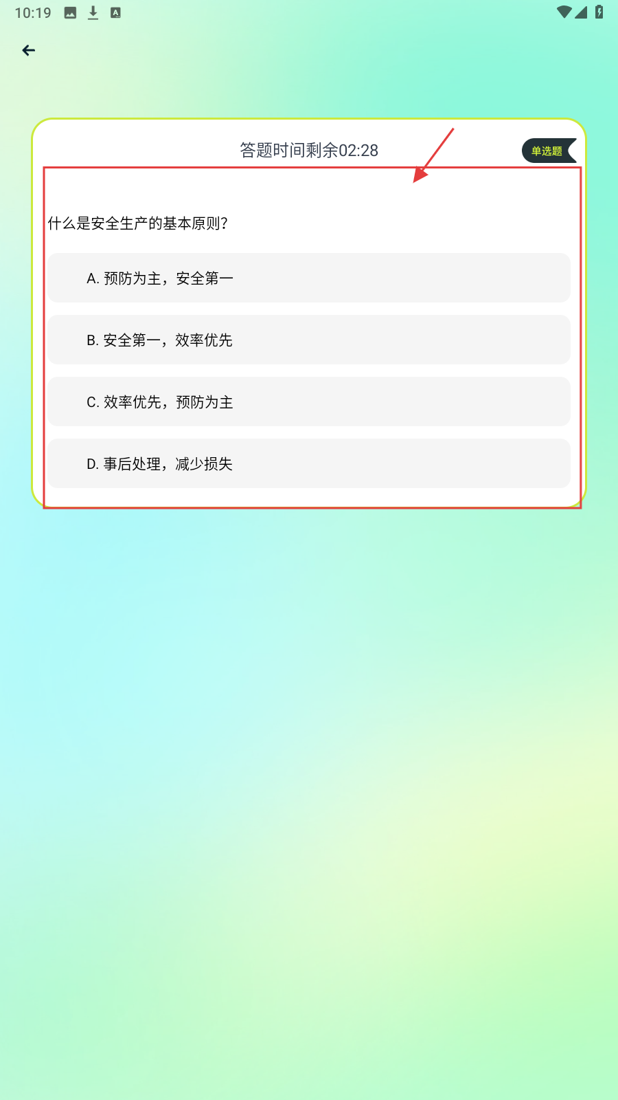 3、开始答题后,仔细看题目在时限内选择答案即可。