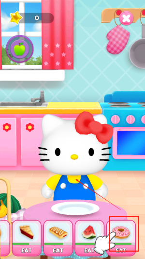 4、喂食:在厨房里,点击食物并选择“EAT”来喂食Hello Kitty,完成日常任务。