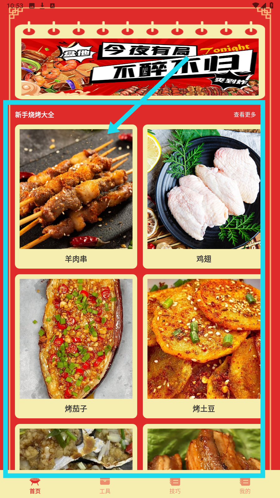 1、打开应用,在【首页】查看新手烧烤大全栏下的菜谱,选择感兴趣的点击。