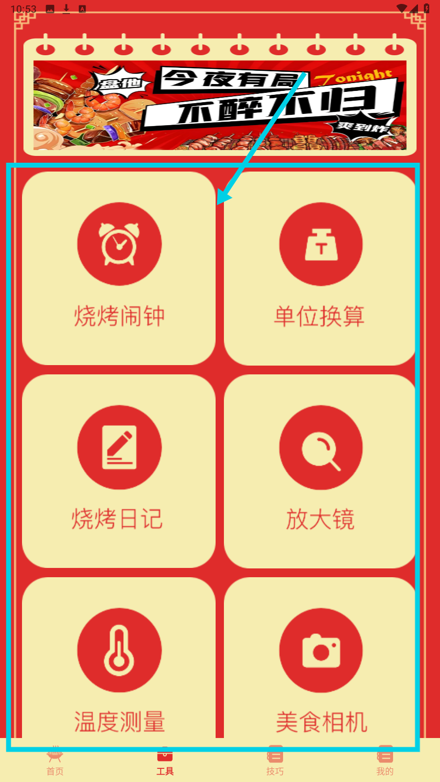 3、进入【工具】页面,有烧烤闹钟、单位换算等功能按钮,按需选择,如点击【烧烤闹钟】。