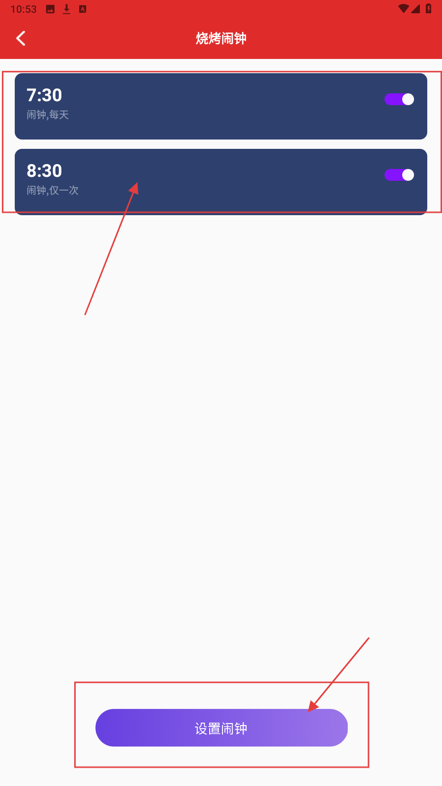 4、进入【烧烤闹钟】页面,查看已有闹钟,也可以点击【设置闹钟】重新设置。