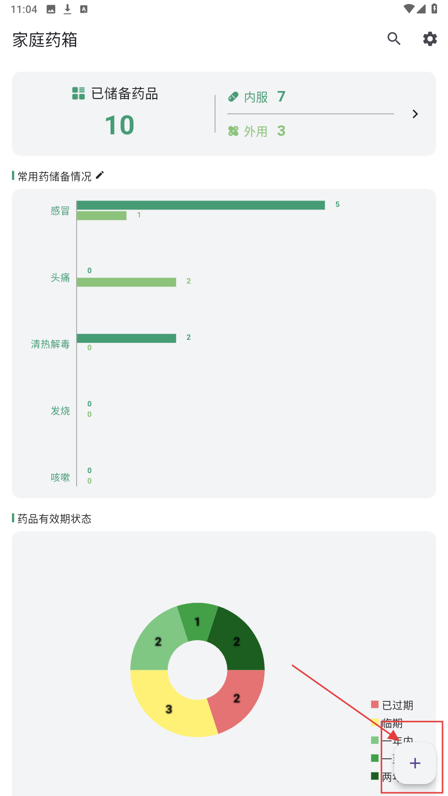 1、进入【家庭药箱】,查看已储备药品及常用药、有效期数据,点【+】添加药品。