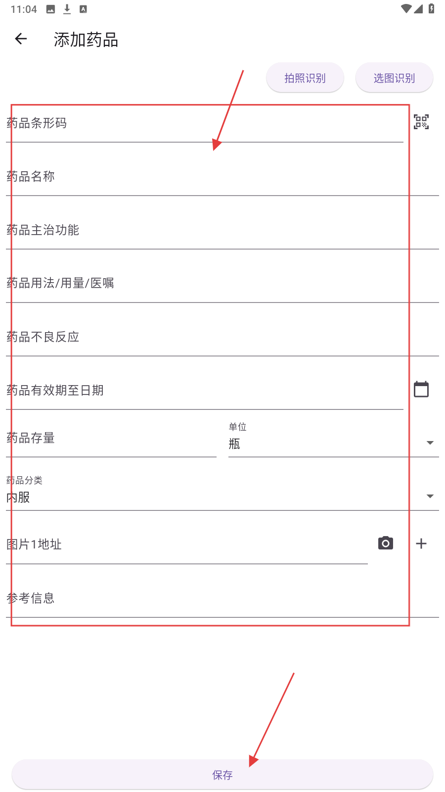 2、在【添加药品】页,填条码、名称等信息,用【拍照识别】【选图识别】辅助,点【保存】。