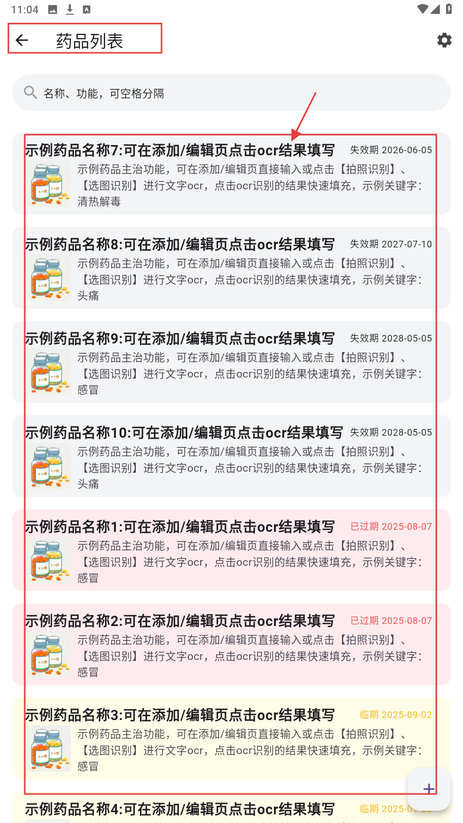 3、前往【药品列表】,浏览药品条目,可借搜索找药品,关注过期、临期状态药品。